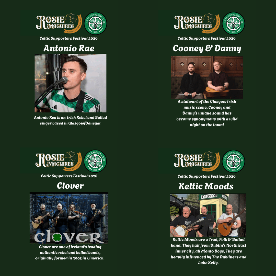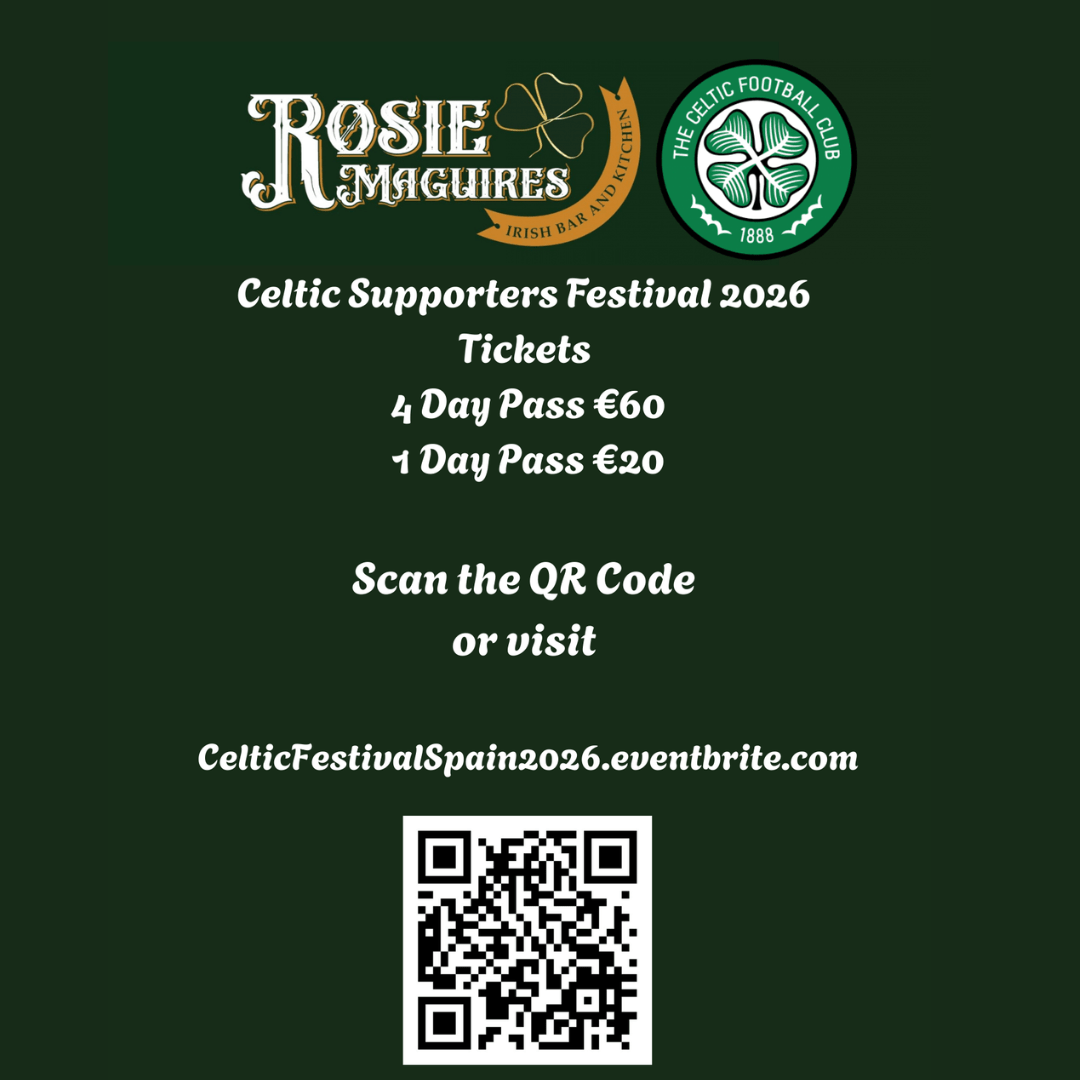 Rosie Maguires are delighted to announce that Antonio Rae, Cooney & Danny, Clover and Keltic Moods will be joining Celtic fans from around the globe at Europe’s Biggest End of Season Party on the Costa Blanca. The Event takes place Thursday 04 June to Sunday 07 June.